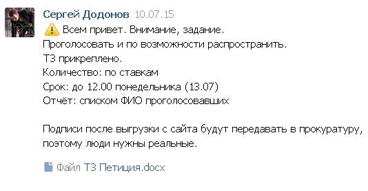 На третьем скриншоте видно обращение некоего Сергея Додонова, состоящего в сообществе «Молодая гвардия» ВКонтакте, где он, по всей видимости, даёт задание на сбор подписей.