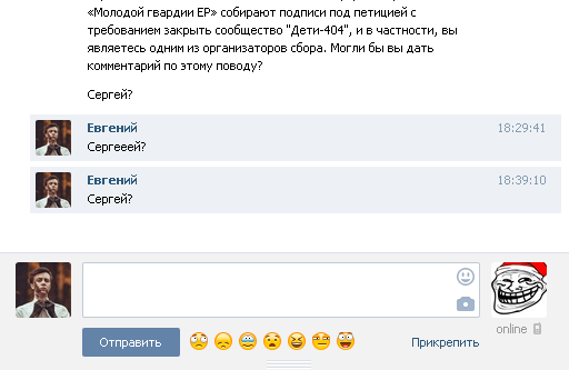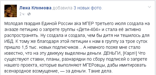 Елена Климова, создатель общественного проекта «Дети-404», занимающегося помощью ЛГБТ-подросткам, уличила движение «Молодая гвардия Единой России» в скупке подписей под петицией на avaaz.org с требованием закрыть сообщество «Дети-404» ВКонтакте.