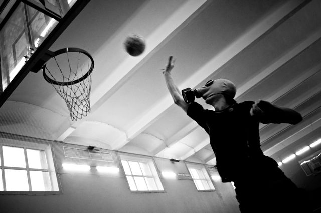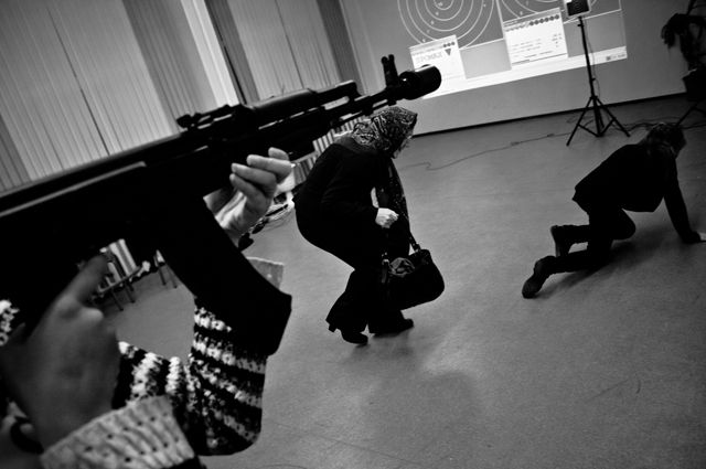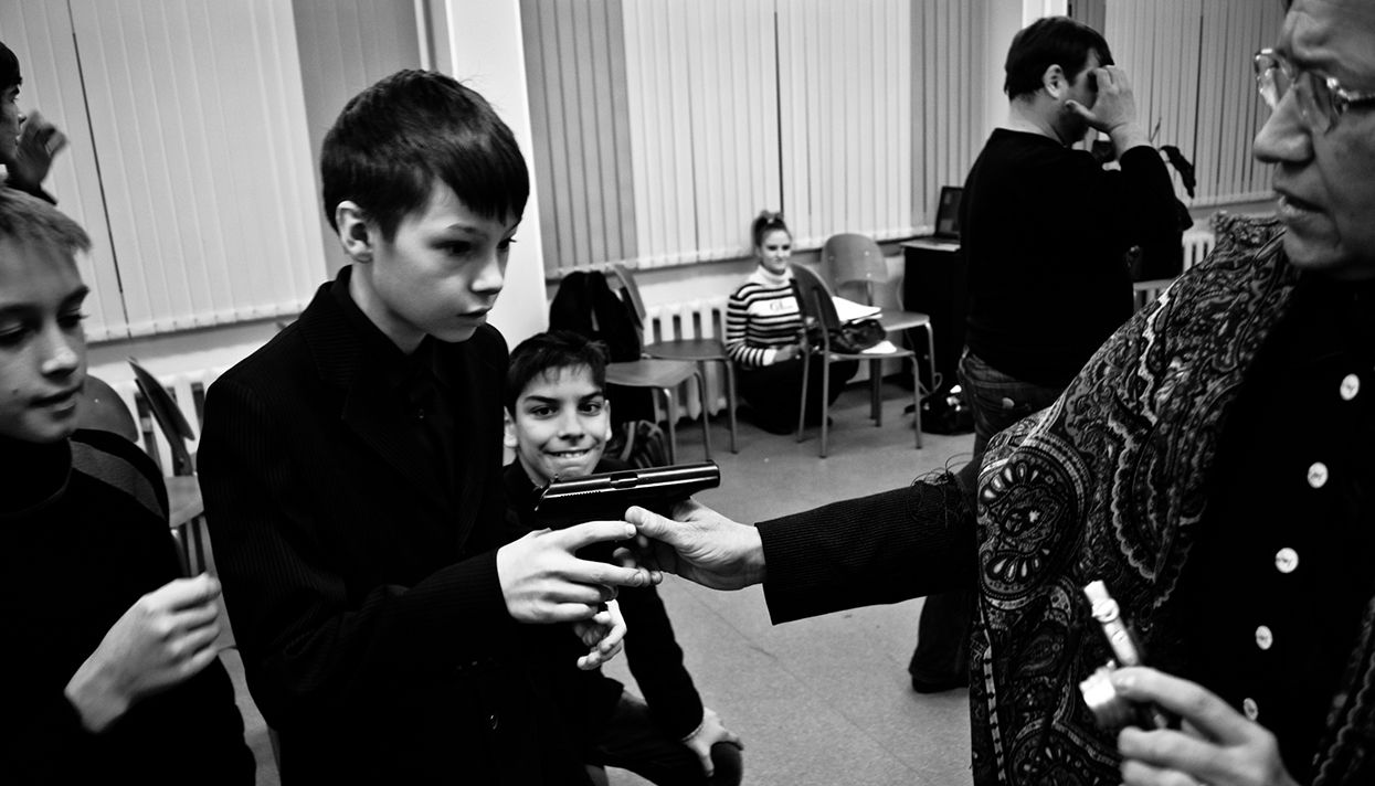 Some clubs offer training in “Ratoborchestvo” or “Ratoborstvo,” a system of fighting said to date back to ancient Slavic tradition. Fighters have to face each other wearing a blindfold; they learn to dodge bullets and knives, to cross difficult terrain, and to take cover from objects which are hurtled at them. The training looks pretty unusual: young people wearing tight balaclavas have to crouch down while someone throws bricks at them from behind. During group knife-fighting exercises, they silently circle the room, bumping into one another and and stabbing where they figure their attacks are coming from. They stand blindfolded in the courtyard, making strange gestures with their hands. Usually the club enlists people over 18, as the fighting involves real pistols, assault rifles as well as knives and sabres. But occasionally, 16- and 17-year-olds also join.