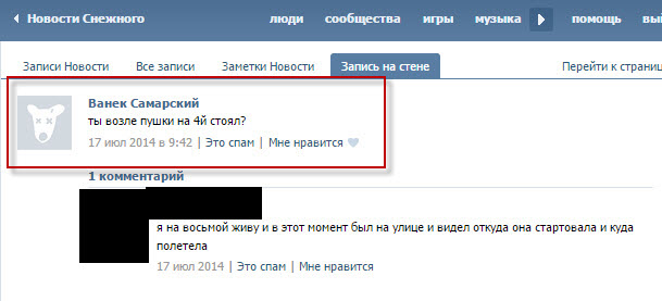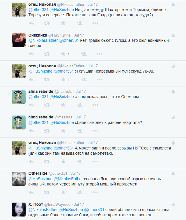 Жительница Снежного (сторонница сепаратистов) по имени Оля Кривошеенко слышала звук, похожий на звук выпущенной ракеты, перед тем, как был сбит МН17. Позднее в ветке обсуждения она говорит, что хорошо, если был сбит украинский самолет, поскольку он летел бомбить Снежное – как это уже было несколькими днями ранее.