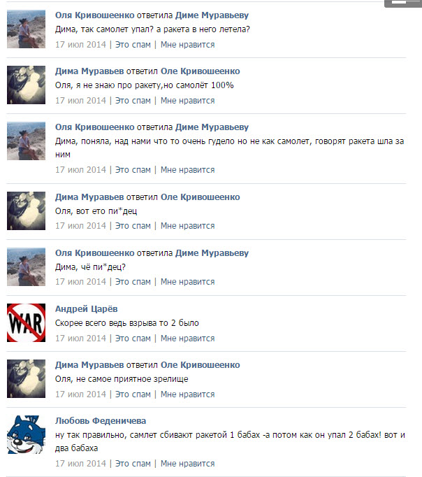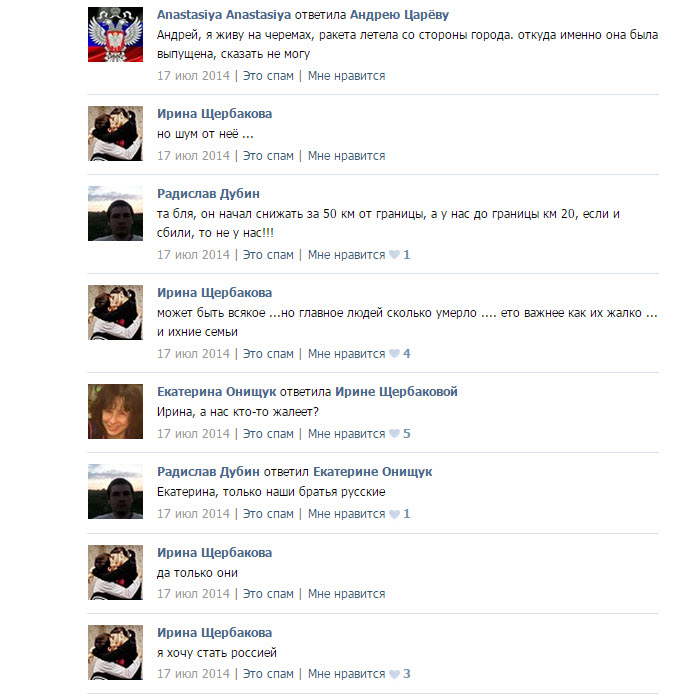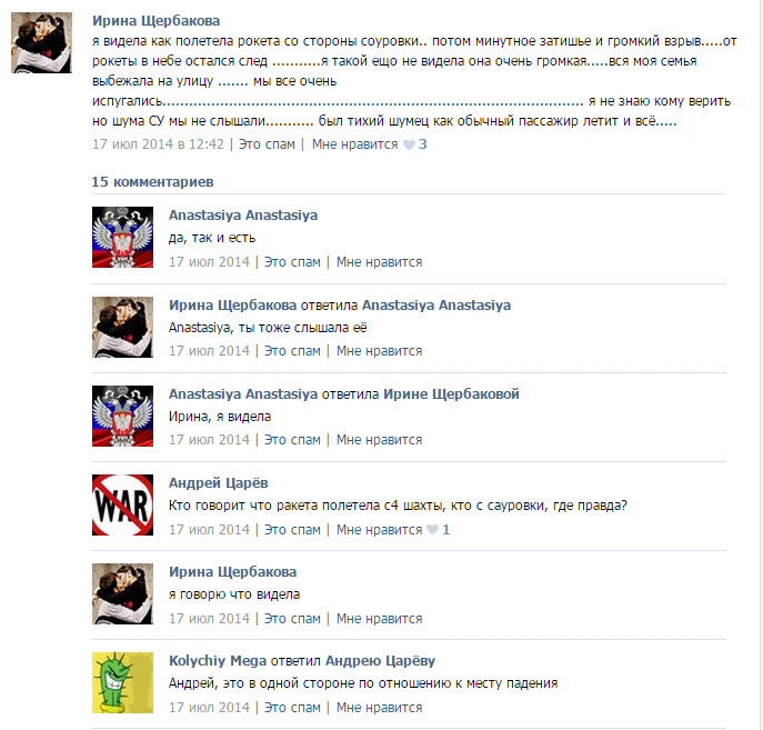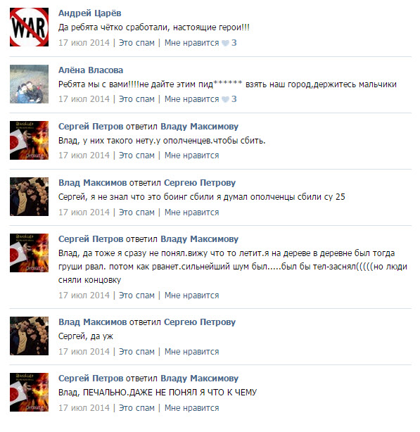 Сразу после того, как был сбит "Боинг", следовавший рейсом МН17, появилось множество версий случившегося – со стороны России, пророссийских сепаратистов, действующих на востоке Украины, и западных стран. Журналисты и следователи собрали многочисленные свидетельства очевидцев, которые соответствуют как украинской ("Боинг" был сбит зенитно-ракетным комплексом "Бук", находившимся к югу от города Снежное), так и российской ("Боинг" был сбит украинской стороной – либо истребителем Су-25, либо собственным "Буком", располагавшимся, скорее всего, у поселка Зарощенское) версии. Однако наиболее прямой и непосредственной информацией можно считать не интервью, взятые спустя недели и даже месяцы после случившегося, а записи в социальных сетях, сделанные утром и днем 17 июля 2014 года – непосредственно перед падением "Боинга" и сразу после него, до того, как стало ясно, что жертвами этого бессмысленного акта стали почти 300 невинных людей.