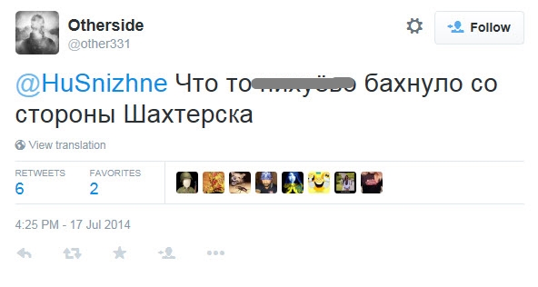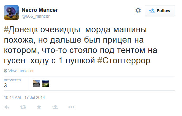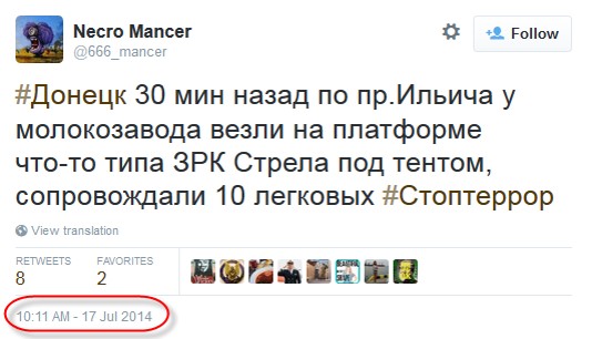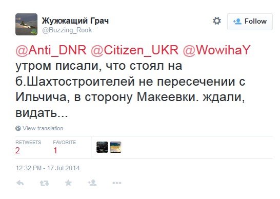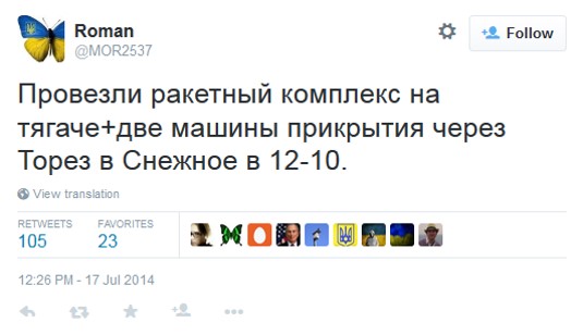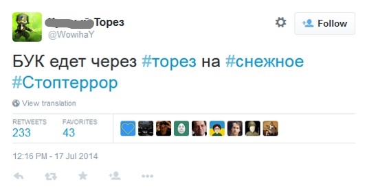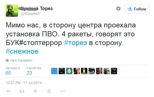 Многие твиты, касающиеся "Бука" (или по меньшей мере крупной единицы боевой техники, которая могла быть "Буком"), были сделаны пользователем @666_mancer. Этот популярный юзер, вероятно, лично не видел описываемые им события, но собирал свидетельства очевидцев с других аккаунтов и делал их перепост у себя. Таким же образом действовал и юзер @WowihaY, который больше не живет в Торезе, но собирает свидетельства местных жителей. Размещение информации о передвижениях сил сепаратистов на собственном аккаунте в соцсетях может быть небезопасным для очевидца, но вполне приемлемым для анонимного юзера или человека, не живущего непосредственно на месте событий. Кроме того, в этих твитах неоднократно используется хэштэг #Stopterror (#Стоптеррор), предназначенный для информирования украинских военных о перемещениях сепаратистов, т.е. речь идет о сборе разведывательной информации местными жителями.
