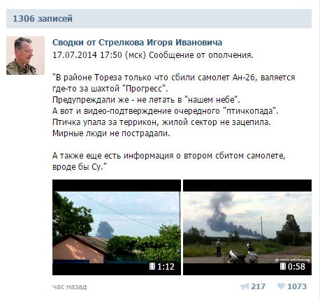 А вот самое известное сообщение, касающееся МН17. Оно появилось в группе "Сводки от Стрелкова Игоря Ивановича" в сети "ВКонтакте". Это не пост, размещенный самим Игорем Стрелковым (Гиркиным), а скорее его "фан-клубом" на основании сообщений с мест. Сразу после того, как стало ясно, что сбит пассажирский самолет, а не военно-транспортный Ан-26, сообщение было удалено.