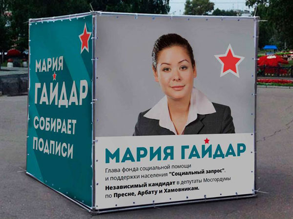 Предвыборный куб Марии Гайдар. Фото: maria.gaidar/facebook.com Комментарий редактора: Мария Гайдар начала свою политическую карьеру как молодой российский оппозиционер. К своим 32 годам она уже является учредителем и руководителем Фонда социальной помощи и поддержки населения «Социальный запрос».