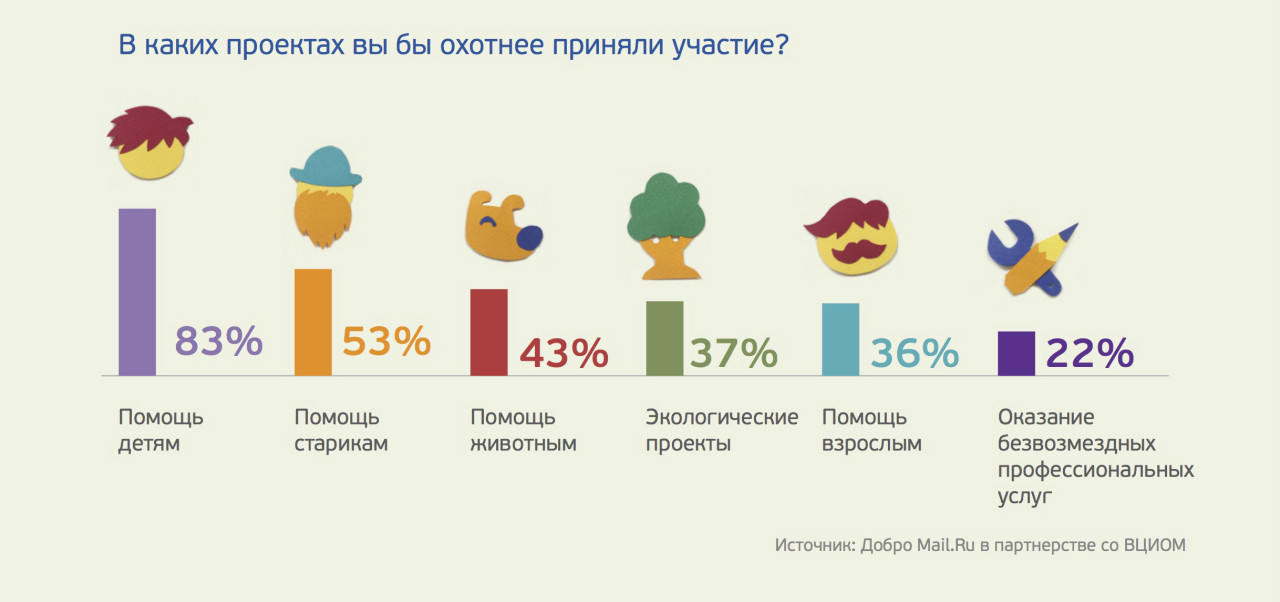 Пару лет назад проект Добро. Mail. ru вместе со ВЦИОМом провели исследование общественного мнения о благотворительности в Интернете. Один из заданных респондентам вопросов звучал так: «В каких проектах вы бы охотнее приняли участие?». Результаты получились ошеломительными. Больше всего, конечно, хотят помогать детям, потом старикам, потом животным, а потом экологическим проектам. И только потом хотят помогать взрослым.