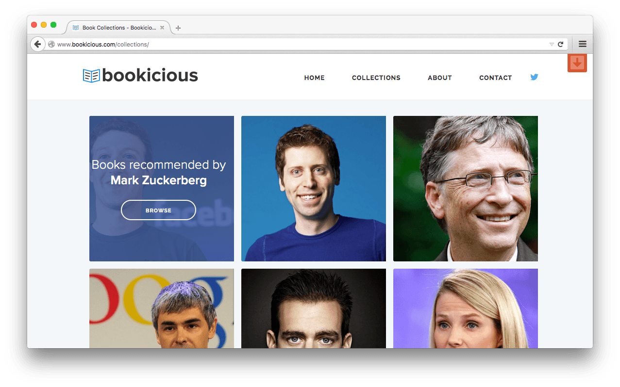 Сейчас Bookicious предлагает 15 подборок книг, рекомендуемых такими известными предпринимателями, как Марк Цукерберг, Билл Гейтс, Ларри Пэйдж, Стив Джобс, Питер Тиль, Элон Маск и другие.