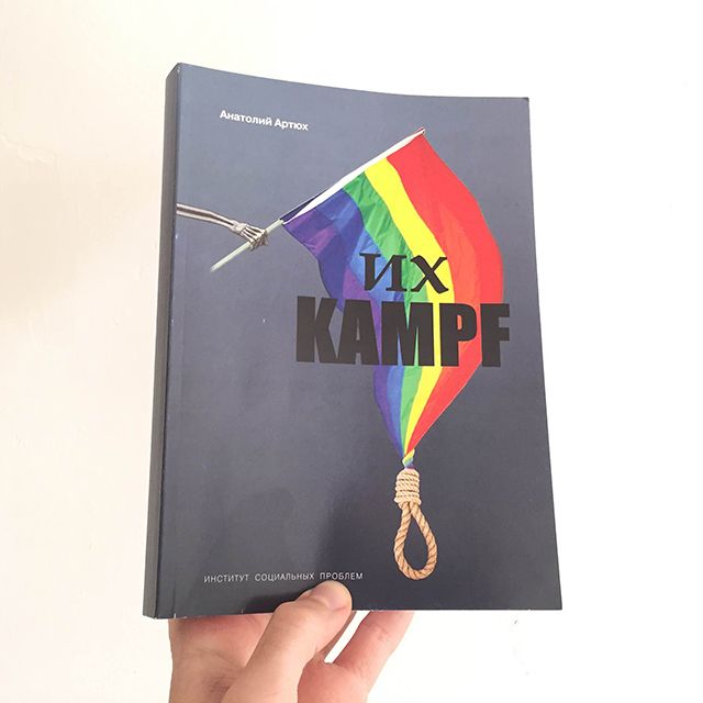 В конце встречи Анатолий Артюх достает из-под стола свою книгу «Их kampf». На обложке — радужный флаг, к которому привязана петля. Открывает первую страницу, чтобы подписать мне дарственную надпись, и выводит ручкой: «Содом не пройдет!»