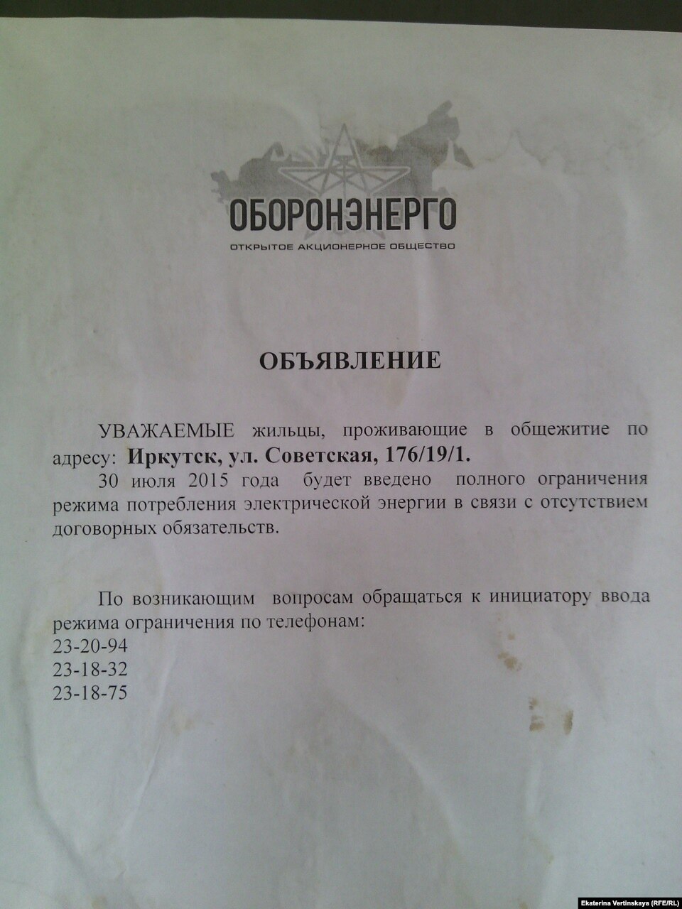 В ночь на понедельник в общежитии, в котором проживают бывшие работники Высшего военного авиационно-инженерного училища, появилось объявление. Это было предупреждение компании "Оборонэнерго" о том, что 30 июля окончательно отключат электроэнергию. По телефонам, указанным в объявлении, иркутяне не могут дозвониться, чтобы уточнить информацию. Люди в растерянности, не знают, что делать дальше.