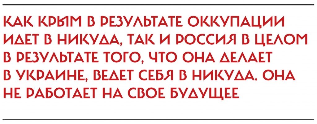 Контрпродуктивна? Нет-нет. Все намного хуже. Я считаю, что она и сейчас, и в будущем создает огромные проблемы для самой России. У нее и так достаточно вызовов. А сегодняшняя ситуация делает преодоление этих трудностей практически невозможным. Как Крым в результате оккупации идет в никуда, так и Россия в целом в результате того, что она делает в Украине, ведет себя в никуда. Она не работает на свое будущее. И чем быстрее поймут это в Москве, тем, я считаю, будет лучше. Вот тогда-то и появится шанс для того, что по-настоящему зовется украинско-российскими отношениями.