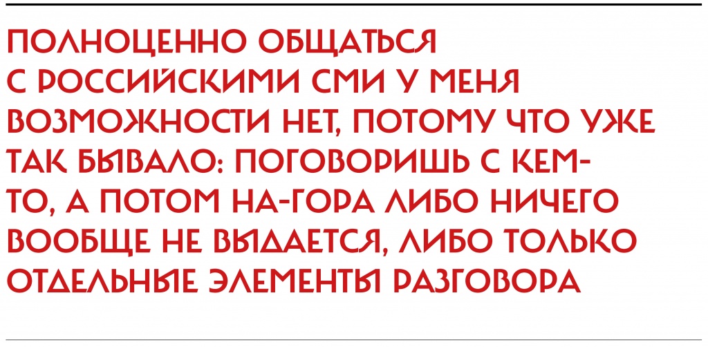 А как проходит ваше общение с российскими пользователями? Люди ведь разные в интернете. Всем даете возможность высказаться? Или какой-то отсев ведете? Ну, во‑первых, это право каждого — высказаться. Я ничего никогда в комментариях не подчищаю, живое общение лучше любого другого. Я лично всегда готов общаться со всеми. К сожалению, полноценно общаться с российскими СМИ у меня возможности нет, потому что уже так бывало: поговоришь с кем-то, а потом на-гора либо ничего вообще не выдается, либо только отдельные элементы разговора. В каком-то смысле возможности общения с российской аудиторией сконцентрированы в социальных сетях. Ну и российские информационные агентства — в отличие от российских телеканалов, они, как ни странно, цитируют меня достаточно точно и полностью.