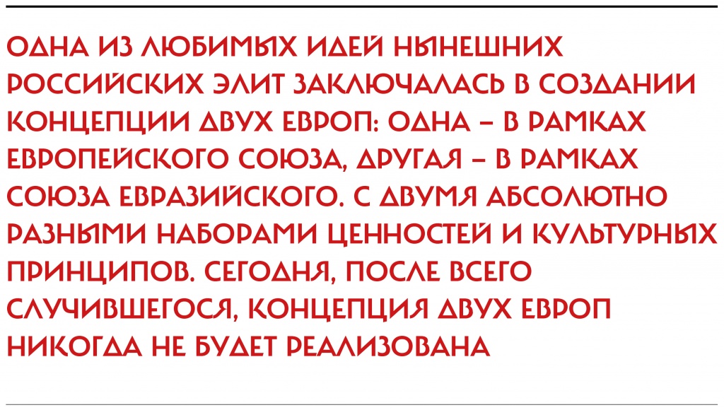 Знаете, я так скажу: сегодняшние события будут иметь определяющее значение для конфигурации Европы и во многом — мира. И вот почему. Одна из любимых идей нынешних российских элит заключалась в создании концепции двух Европ: одна — в рамках Европейского союза, другая — в рамках союза Евразийского. С двумя абсолютно разными наборами ценностей и культурных принципов. Сегодня, после всего случившегося, концепция двух Европ никогда не будет реализована.