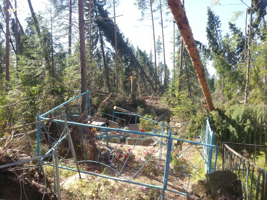 — Началось все в деревне. Страшный ветер подул, клубились тучи, а потом все унесло в сторону кладбища. Утром я сел на велосипед и поехал посмотреть могилки родных. И был в шоке: дорога была завалена соснами и елями — не пройти. Вместе с остальными деревенскими потом пошли через болото, некоторые могилы были завалены, как сейчас, некоторые даже вскрыты из-за выкорчеванных корней, — рассказал «7х7» житель деревни Уница Лембит Покусаев.