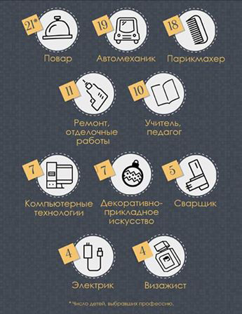 Инфографика центра «Полдень» В опросе приняли участие 180 детей из детских домов Москвы, Санкт-Петербурга, Ростова-на-Дону, Нижнего Новгорода и Екатеринбурга. В выборку вошли ответы только тех детей, которые однозначно определились с выбором профессии, а инфографика составлена на основе топа пожеланий. При этом в Центре отметили что из всех опрошенных девятиклассников только шесть человек намерены идти в 10-ый класс.