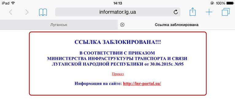 «Министерство инфраструктуры, транспорта и связи Луганской народной республики» (с конца июля разделено на 2 министерства: инфраструктуры и транспорта и, соответственно, связи) выпустило приказ №95 от 30.06.2015 г., в котором обозначен первый список запрещенных интернет-ресурсов на территории ЛНР.