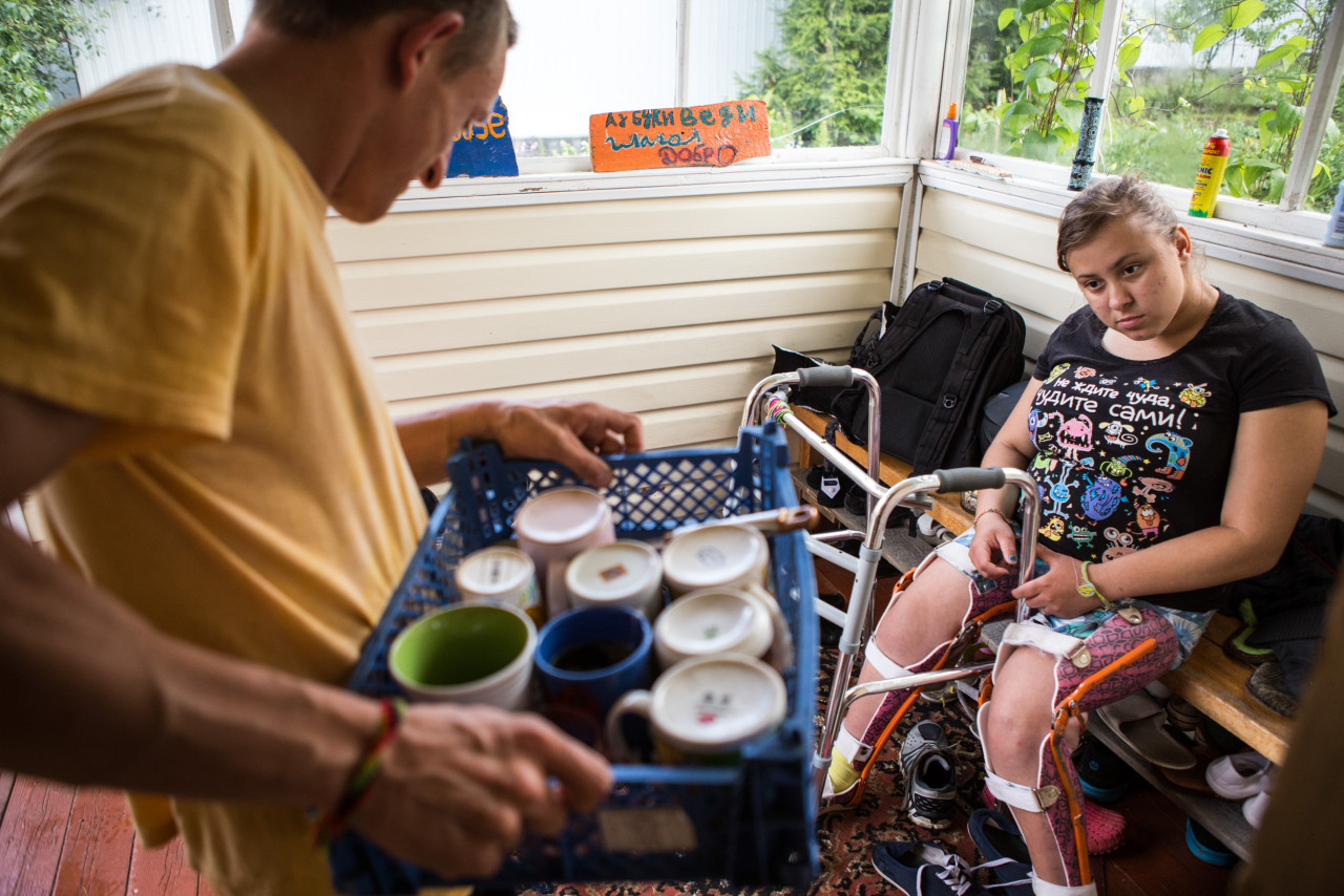Некоторые подопечные — например, Рустам и Игорь — никогда не смогут жить самостоятельно. У остальных есть шанс. Скажем, у Серёжи — «нытика», как называет его Валя. Мы заходим на кухню коттеджа, где Серёжа заканчивает строгать ингредиенты для окрошки. «Небо на асфальте / Звезды на асфальте / Мама, на ней панама, / И вечно пьяный папа», — поет группа «Пилот» из кассетного магнитофона.