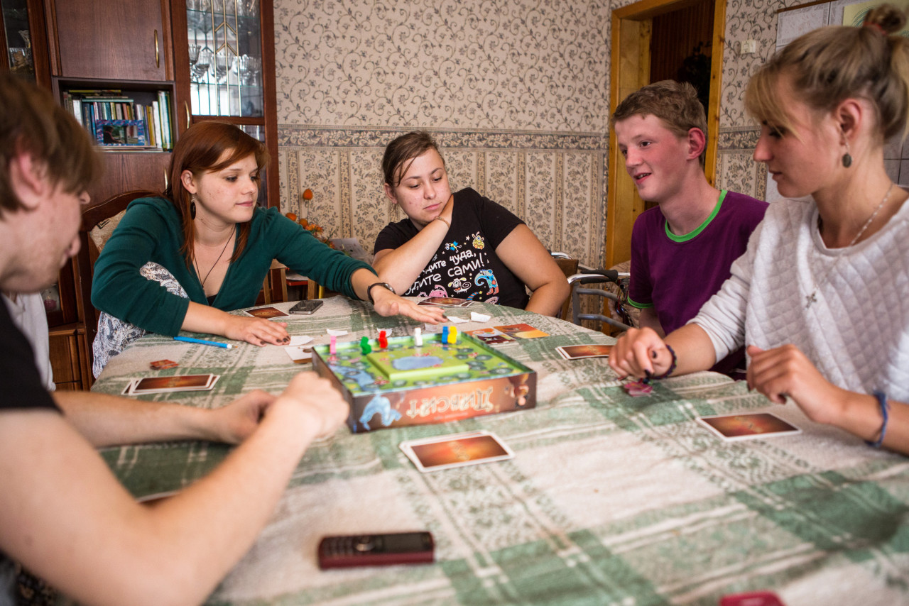У Сони нет умственной отсталости, но есть спинномозговая грыжа. Ей много раз делали операции, она не может передвигаться без ходунков. В остальном Соня — одна из самых беспроблемных подопечных «Детей Павловска». Она помогает волонтёрам: например, читает ребятам вслух, по слогам, детскую книгу про девочку Молли. Остальные или читают хуже, или — как Лиза и Саша — почти не читают вовсе: долгие годы их просто этому не учили. Когда мы играем в «мафию», волонтёры уводят Лизу с Сашей в другую комнату, чтобы прочитать им роли, написанные на бумажках, которые они вытянули.
