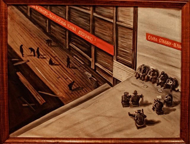 The next morning, I went back to the museum. "Most likely, it hung in the management’s office of the BBK in Stalin's time,” said a museum employee. Of course, the management, I thought, because Rodchenko worked and lived there, and there wasn’t just a lab, but a whole workshop for artists. And Rodchenko was not only a photographer, but an artist. True, he wasn’t a very good “graphic artist.” The reality is that he didn’t know how to draw, but rather just painted constructions with a "ruler and compass," though he received his education from an art school in Kazan. Who, apart from Rodchenko, could draw from a proper photo in the Gulag? The imprisoned canal workers? It is unlikely that they would have access to Rodchenko’s photos. And anyway, what would be the point? Propagandistic images are far more effective. Therefore it’s logical to assume that he did it himself. There was enough time. And the circumstances also correspond. Yes, and there are references in the diaries that Rodchenko used photos for the painting of pictures.