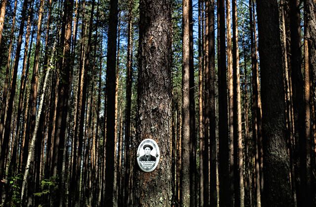 The dark forest—so dark, in fact, that the road wasn’t visible. Dozens of burial pits. In them between 100 and 200 people who were shot—in the back of the head. Here and there, there’s a cross, a Star of David, a crescent moon. One stone is engraved, “People: do not kill each other." On another: “Forgive us." Someone wrote poems about the White Sea Canal and stuck them on the tree trunk. Another did a pencil sketch of a missing relative. Someone else put a framed photograph next to a plastic flower and lit a candle.