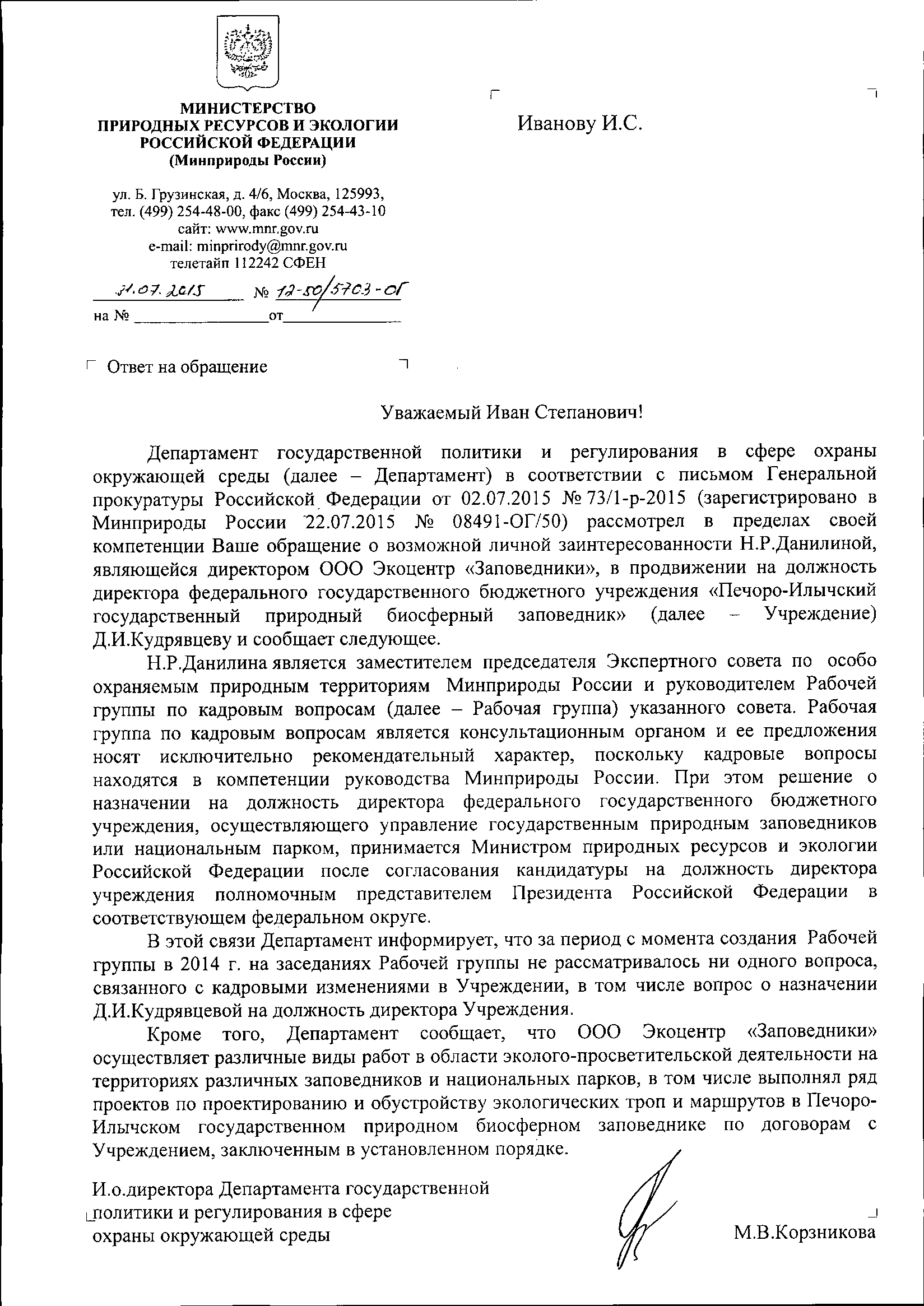 Минприроды России опровергло личную заинтересованность руководителя рабочей группы при ведомстве в назначении директора Печоро-Илычского заповедника в Коми