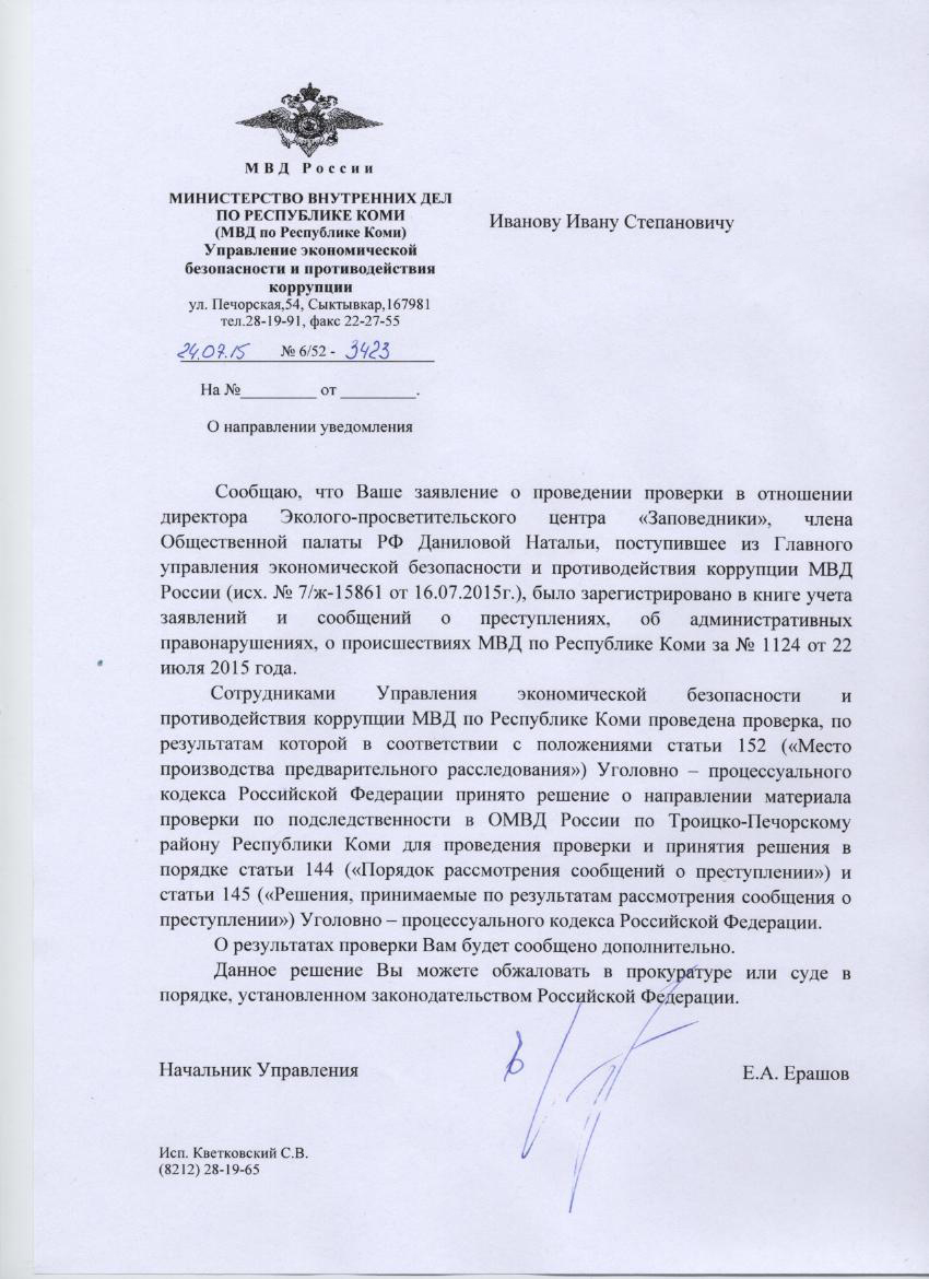 Также, по информации Иванова, Генеральная прокуратура направила его обращение в главное управление экономической безопасности и противодействия коррупции МВД России, после чего оно было направлено в аналогичное управление полиции по республике Коми котороев свою очередь передало его для проведения проверки в ОМВД по Троицко-Печорскому району.