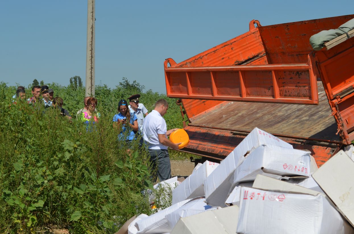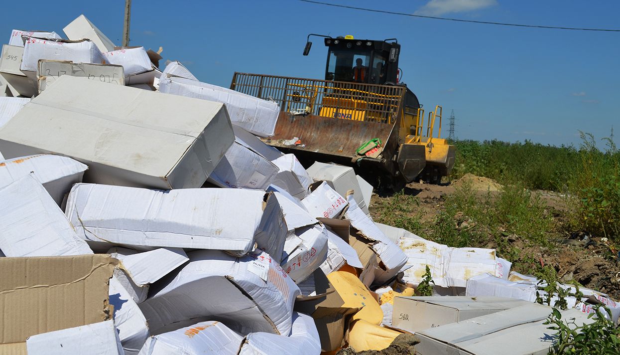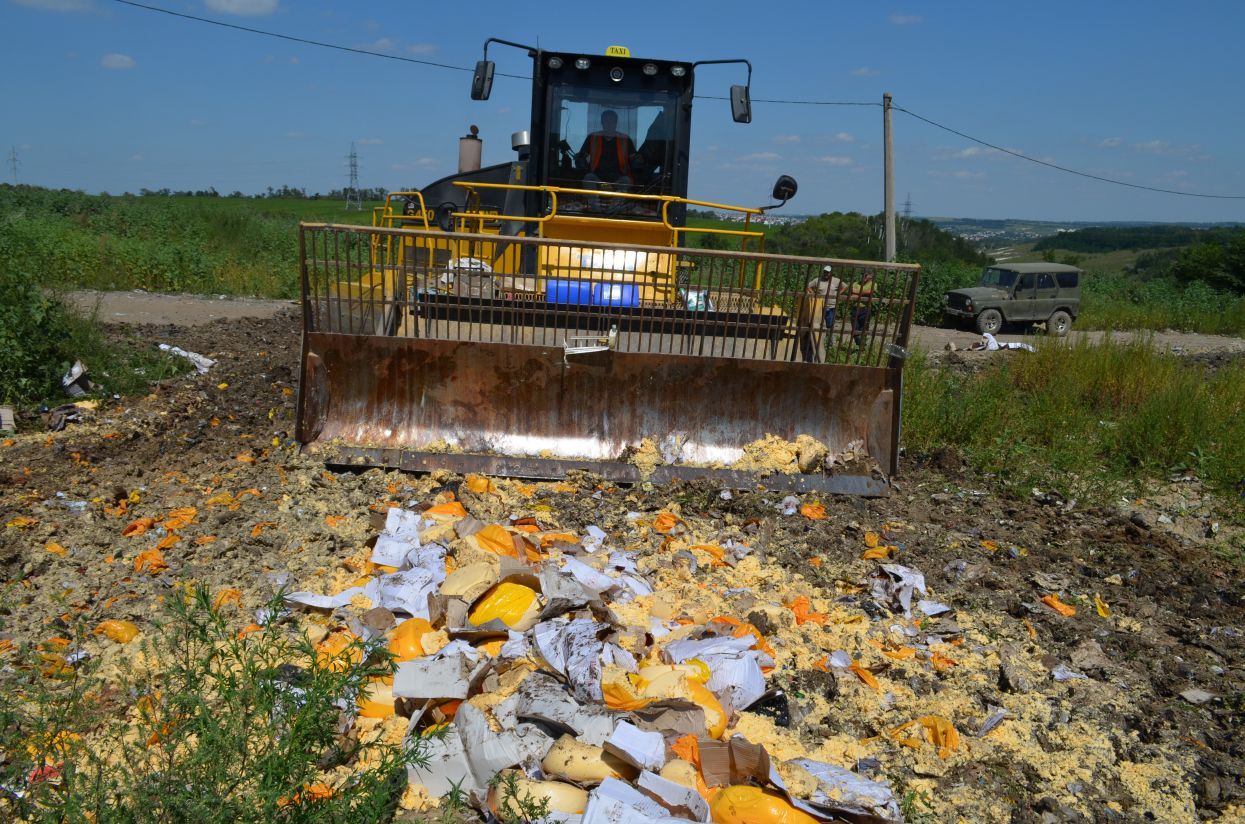 В Белгородской области с этой работой справились с помощью 45-тонного катка, который примерно за час раздавил девять тонн сыра на полигоне бытовых отходов. Затем сыр сгребли в яму и закопали. Региональное управление Россельхознадзора показало, как уничтожают продукты.