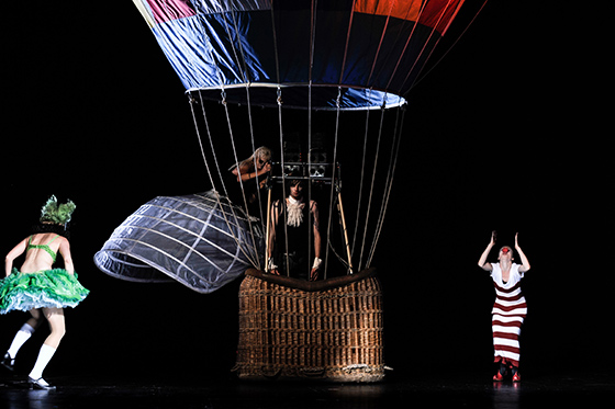© Salzburger Festspiele / Arno Declair Еще одним стихотворением стали декорации Евы-Марии Бауэр. Разноцветный занавес не открывается очень долго, но, когда он уползает, становится понятно, что это — оболочка огромного воздушного шара, лежащего поперек сцены. Единственный элемент сценографии спектакля, он выглядит материализованной мечтой о будущем, воплощением надежд, доставляющим к ним транспортным средством.