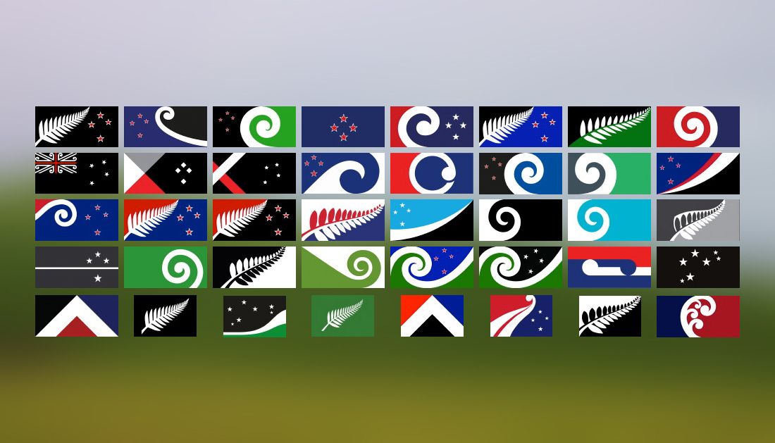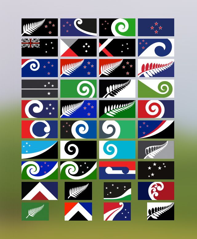За время работы на рассмотрение новозеландской комиссии было прислано более 10 тысяч работ. Большинство использовало принятые символы Новой Зеландии: изображения Южного Креста или ветви папоротника — циатеи серебристой. Некоторые авторы предлагали задействовать менее консервативную символику: птицу киви, овцу или хоббитов. Среди вариантов, рассмотренных комиссией были «Киви-терминатор», «Двуногая овечка» и «Киви из фильма „Начало“».