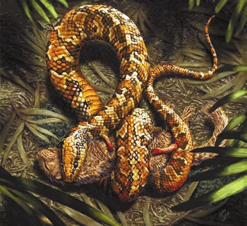 Это существо, по мнению исследователей, представляет собой переходную форму между ящерицей и змеей, первую известную протозмею с четырьмя конечностями. У него много истинно змеиных черт, в том числе единственный ряд брюшных чешуй, изогнутые зубы и, конечно, длинное тело со 160 спинными позвонками (у змей их должно быть больше 150) и хвост, который короче тела — в нем 112 позвонков. Исследователи назвали это животное Tetrapodophis amplectus. Родовое название по-гречески означает «четвероногая змея», а видовое переводится с латинского как «обнимающий». Ученые полагают, что тетраподофис, благодаря множеству позвонков, был очень гибким, мог уложить тело в петли и обвивал свою жертву, как показано на рисунке 2. Очевидно, животное перемещалось по-змеиному, но еще сохранило маленькие цепкие лапки с пятью длинными тонкими пальчиками, последний палец длинный и изогнутый (рис. 3). Структура конечностей говорит о том, что они не были бесполезными рудиментарными придатками — змея для чего-то их использовала. Для рытья эти лапки слишком деликатны, хотя пропорции черепа и тела, а также особенности строения позвонков свидетельствуют, по мнению исследователей, о роющем образе жизни. Скорее всего, длинными пальчиками животное удерживало добычу или партнера во время спаривания.