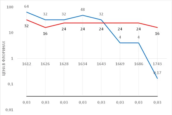 Закономерен тот факт, что с ростом знаний как у фармакологов, так и у зоологов популярность этого средства неуклонно снижалась. Вслед за этим падала и цена. На рис. 1 приведен график изменения цены полунции рога единорога в XVII–XVIII веках. С начала XVI века стоимость падала с 64 флоринов за половину унции до жалких 10 крон в 1743 году, что всего лишь в пять раз превосходило стоимость слоновой кости, используемой в обычных поделках. В действительности к тому времени общество уже успело разочароваться в роге единорога как в волшебном снадобье и смогло убедиться в его истинном происхождении. Промысел нарвала привел к тому, что бывшая диковинка стала вполне обычным явлением, спрос на нее упал, как падает потребность в переставшей быть модной игрушке. Одно хорошо еще, что до этого не успели перебить всех нарвалов, ведь современность демонстрирует нам, что и такое возможно…