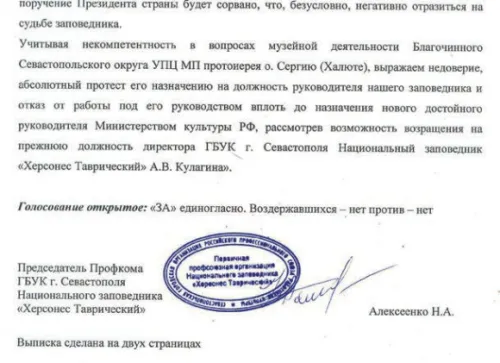 В первую неделю августа российское научное и музейное сообщества пережили настоящий шок: генеральным директором Национального заповедника «Херсонес Таврический», всемирно известного археологического памятника, внесенного в Список мирового культурного наследия ЮНЕСКО и одного из крупнейших научных центров Крыма, был назначен протоиерей Сергий Халюта. Это решение назвал провокационным директор Эрмитажа и президент Союза музеев Михаил Пиотровский, против него выступил советник президента по культуре Владимир Толстой. Заявления по поводу скандального назначения опубликовали Отделение историко-филологических наук РАН, Совет по науке при Минобрнауки, Комиссия по контролю за реформами в сфере науки, Вольное историческое общество, Российское историческое общество. Коллектив заповедника в полном составе выразил недоверие новому директору и заявил об отказе работать под его началом.