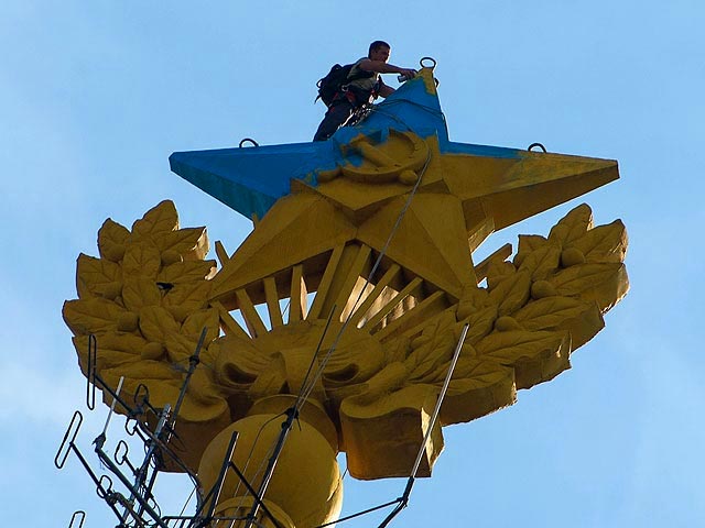 Акция с покраской звезды на шпиле сталинской высотки на Котельнической набережной в цвета украинского флага была проведена в ночь на 20 августа 2014 года. Ответственность за нее взял на себя украинский руфер Павел Ушевец по прозвищу Mustang Wanted, опубликовав фотографии того, как он красит звезду.