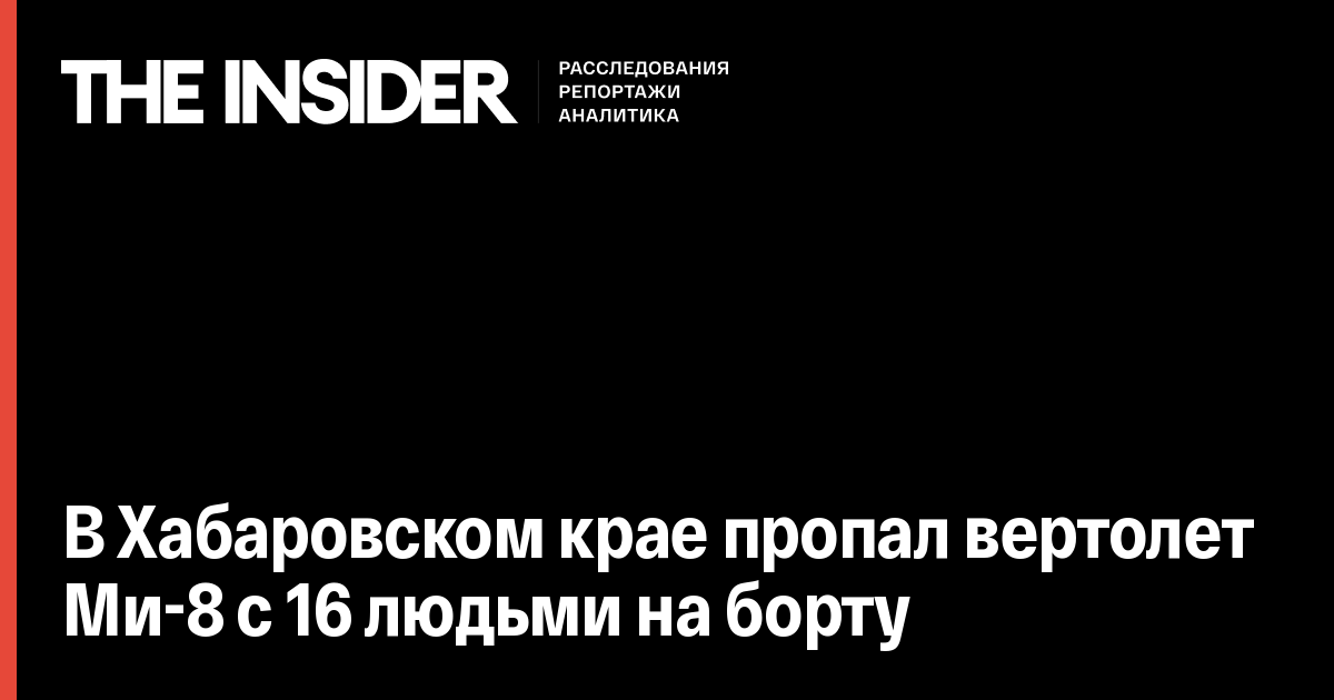 «В назначенное время вертолет не приземлился и на связь не вышел», — говорится в сообщении.В поисках вертолета задействованы два вертолета Ми-8 авиакомпании «Восток», самолет АН-26 региональной поисково-спасательной базы, самолет АН-74 Хабаровского Авиационно-спасательного центра ДВРЦ МЧС России.