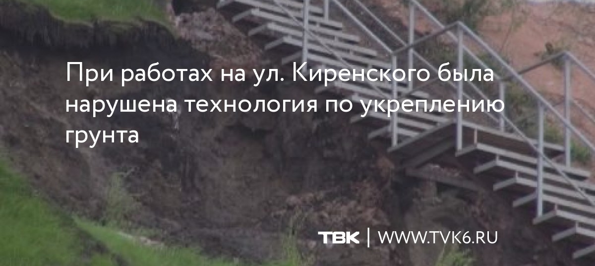 По данным управляющей компании «Орбита», в 2014 году на общем собрании собственников жилья многоквартирного дома было принято решение о благоустройстве близлежащей территории дома – в том числе склона – и установки лестницы. Подрядчиком была выбрана компания ООО «Аркада».Администрация Октябрьского района и комиссия по оценке технического состояния зданий обследовала место схода грунта на ул. Киренского, 24 «А». О том, что земля под лестницей сильно проседает, Новости ТВК сообщили накануне.