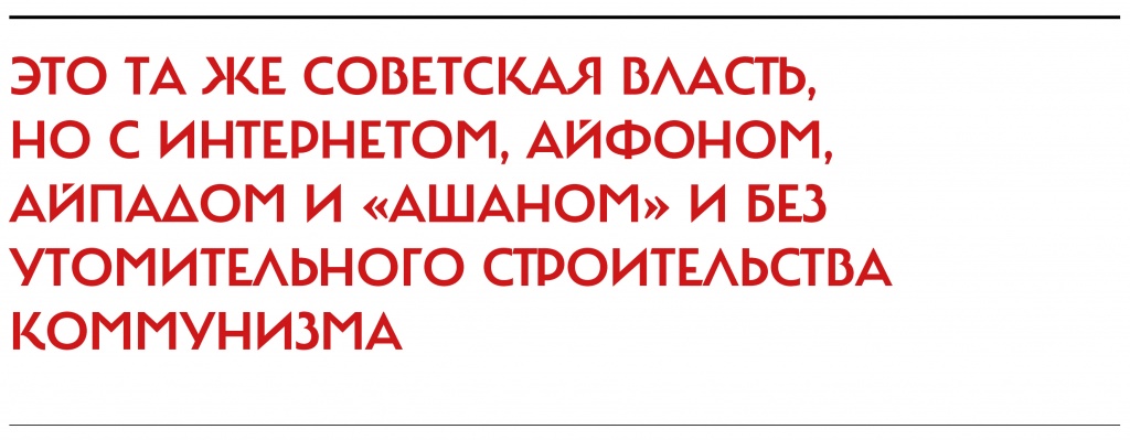 В общем-то теперь и воспроизводится та же самая советская власть, которая в тех или иных формах и обличиях существовала и до и после нее самой. Это та же советская власть, но с интернетом, айфоном, айпадом и «Ашаном», ничуть не изменяющими внутреннюю ее структуру, а служащими лишь чем-то вроде косметики, которая, если надо, легко и быстро смывается влажной тряпочкой.