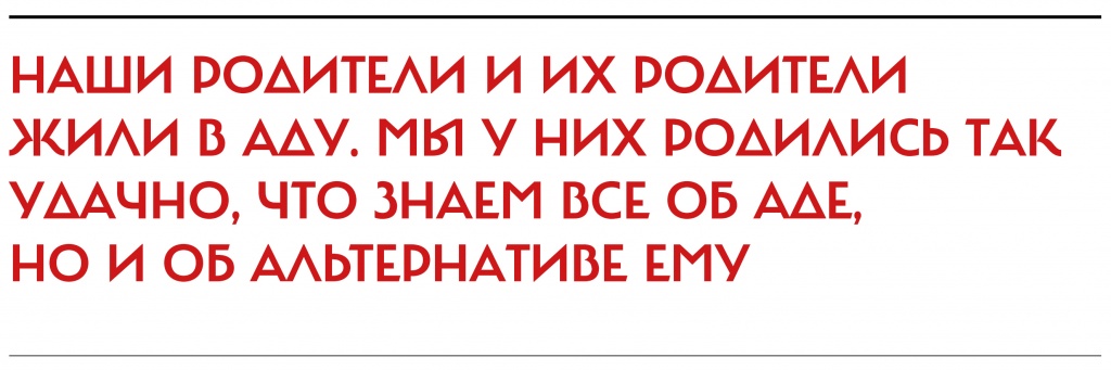 Наши родители и их родители жили в аду, в настоящем аду голода, лишений, войны, изоляции, террора. В их жизни были ужас, повседневная смерть, ГУЛАГ, нищета, унижение, железный занавес. То, что некоторые из них выжили, — уже чудо. Мы у них родились почти вопреки обстоятельствам, родились так удачно, что знаем все об аде, но и об альтернативе ему. Мы, не меняя квартиры, жили, учились и работали в трех как минимум разных странах. В период глобальной технологической революции, на стыке веков. Мы продвинутые пользователи очереди за туалетной бумагой, дискового телефона и механической пишущей машинки, но и капризные обладатели новейших гаджетов. Мы — балованные и неблагодарные. Это нормально. Планка требований, очевидно, всегда должна повышаться, ожиданиям естественно расти.