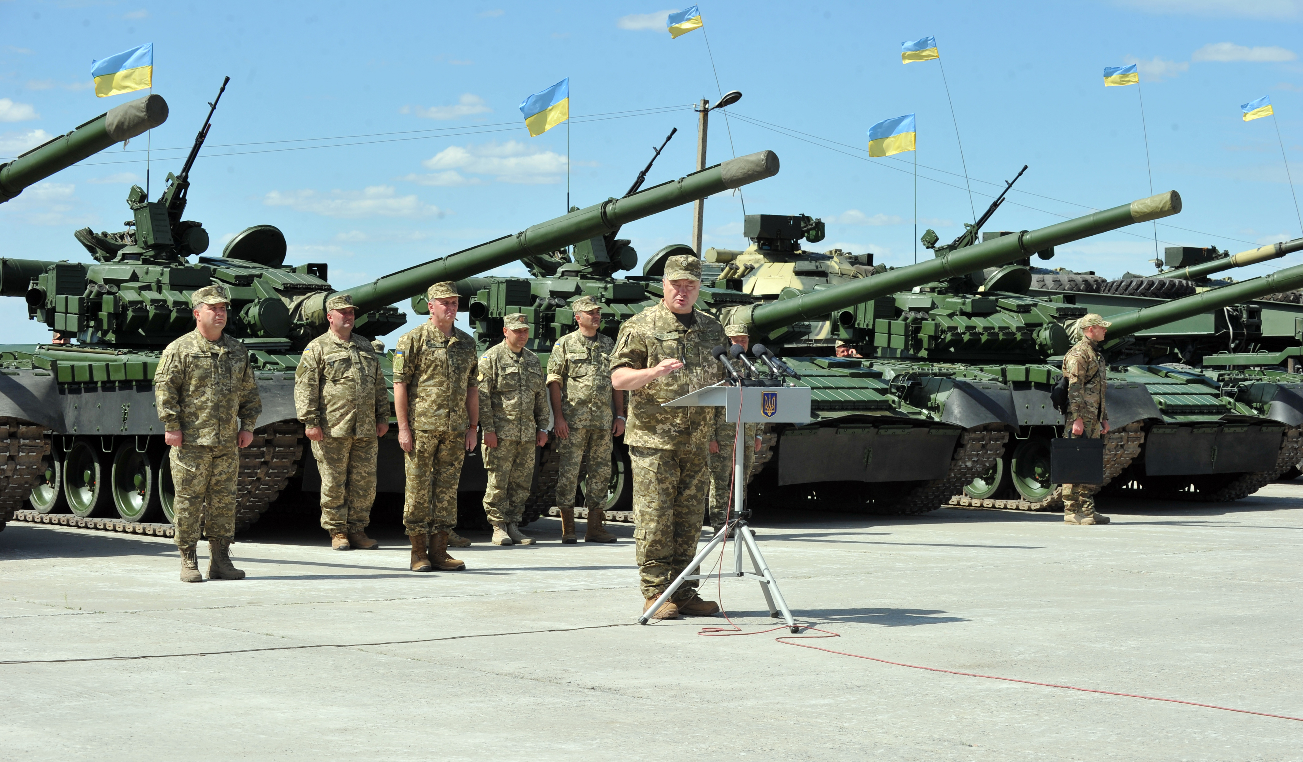 В преддверии Дня независимости президент Украины Петр Порошенко в городе Чугуев Харьковской области участвовал в церемонии передачи восстановленной военной техники подразделениям АТО. Армейцы получили 170 единиц техники – танки, боевые машины и ракетные комплексы. С аэродрома в Чугуеве в зону боевых действий отправились и 20 военных американских машин "Хаммер".