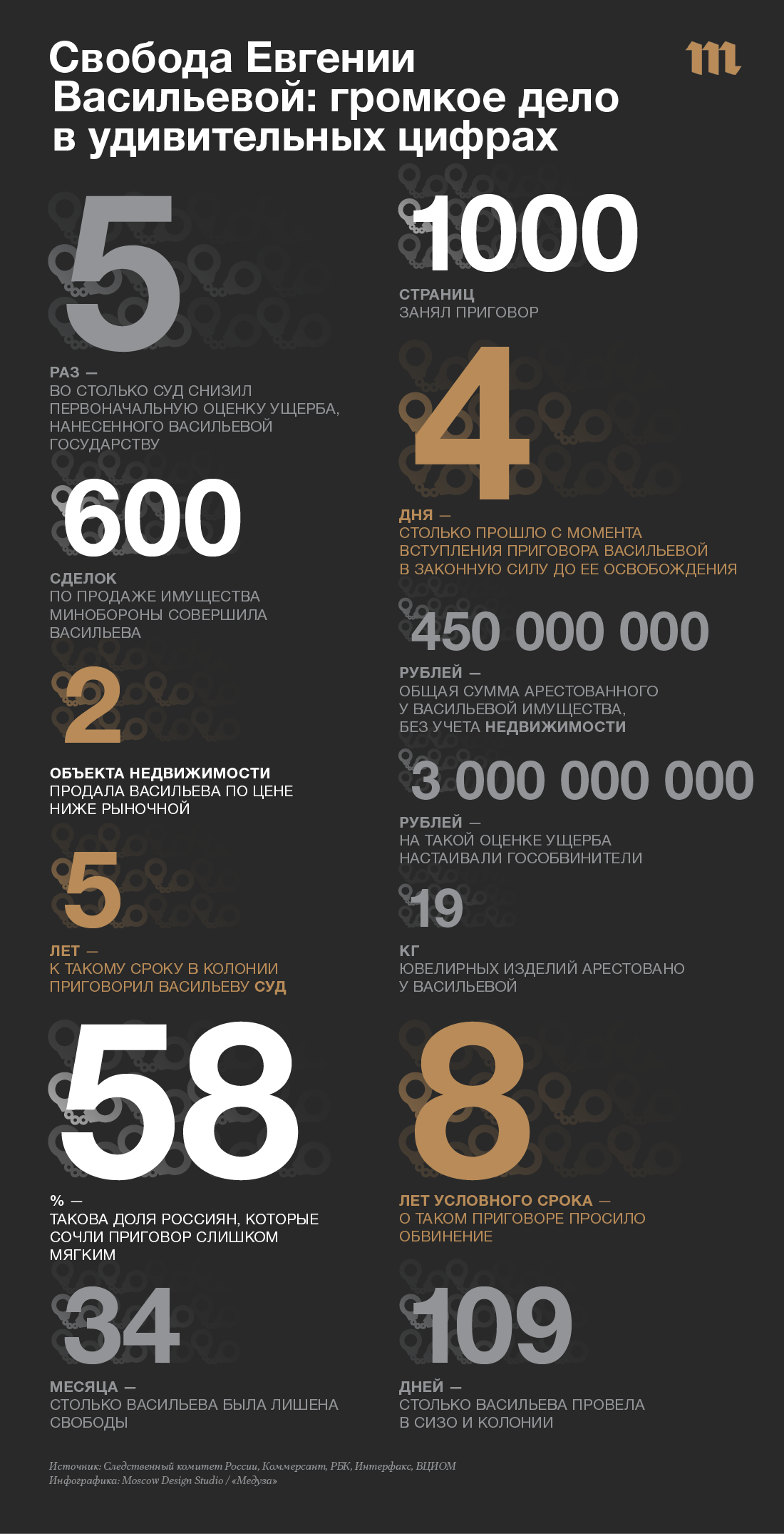 Судогодский районный суд Владимирской области удовлетворил прошение о досрочно-условном освобождении Евгении Васильевой, главной фигурантки дела «Оборонсервиса». Васильева была признана виновной в мошенничестве в особо крупном размере, легализации доходов и злоупотреблении служебным положением, но это не помешало ей выйти на свободу через четыре дня после вступления приговора в законную силу. «Медуза» показывает и другие интересные числа из дела «Оборонсервиса».