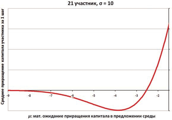 Оказывается, что в умеренно неблагоприятной среде (при μ примерно от –0.8σ до –0.26σ, когда голосующих 21) наблюдается «яма ущерба»: среднее приращение капитала за 1 шаг отрицательно. Тем самым в результате решений, принятых простым большинством, общество разоряется. Как и в теореме Малишевского, причина в том, что меньшинство в среднем теряет больше, чем приобретает большинство.