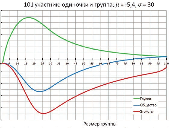 Как реализовать солидарность на практике? Вероятно, участникам нужно объединиться в группу и поддерживать предложения, приемлемые для группы в целом. Пусть таковыми считаются предложения, повышающие суммарный капитал группы [3]. Важно отметить, что, вступая в группу, участник принимает на себя обязательство голосовать в интересах группы даже тогда, когда они расходятся с его собственными. На рис. 3 показан случай, в котором общество, состоящее из эгоистов, находится в «яме ущерба»: если группы нет, среднее приращение капитала участника за 1 шаг отрицательно. Мы видим, что начиная с группы в два участника и кончая группой, включающей всех, кроме одного, член группы существенно превосходит эгоиста по среднему приращению капитала. Тем самым у эгоистов всегда есть сильный стимул присоединиться к группе. Поначалу рост группы чрезвычайно выгоден для нее, но при 17 участниках дальнейшее расширение группы приводит к снижению среднего приращения капитала ее члена. При 17 членах группа, возможно, была бы рада прекратить прием и остаться кликой, но обществу выгодно сохранить ее открытость. Тогда, пройдя через минимум (при 24 участниках в группе) и через присоединение к группе 80% участников, общество придет к положительным средним значениям приращения капитала. Еще эффективнее действовали бы альтруисты, но это другая история. В нашем же сюжете групповой эгоизм становится почти альтруизмом, как только группа приближается по численности ко всему обществу.