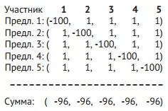 Доказательство этой теоремы (очень простое) не менее поучительно, чем сама теорема. Идею его поясним на примере. Пусть голосующих пятеро, A = (101, 101,101, 101, 101), X = (0, 6, 6, 6, 50): состояние X значительно хуже, чем A, для всех голосующих. Поставим на голосование пять предложений (рис. 1). Предложение номер i состоит в том, что капитал i-го участника уменьшается на 100, а капитал каждого из остальных увеличивается на 1. Каждое из этих предложений принимается большинством в 4/5, и после их реализации коллектив приходит к состоянию В = (5, 5, 5, 5, 5). Теперь большинством в 4/5 принимается предложение, переводящее B в X: оно выгодно для всех голосующих, кроме 1-го.