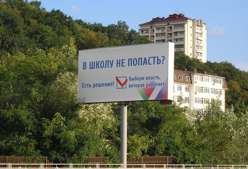 В гор. Сочи установлены рекламные плакаты возле дорог с надписями: » Спортплощадки во дворе нет? Дороги разбиты? В школу не попасть? и т. д… Есть решение… Выбери власть, которая работает…»…