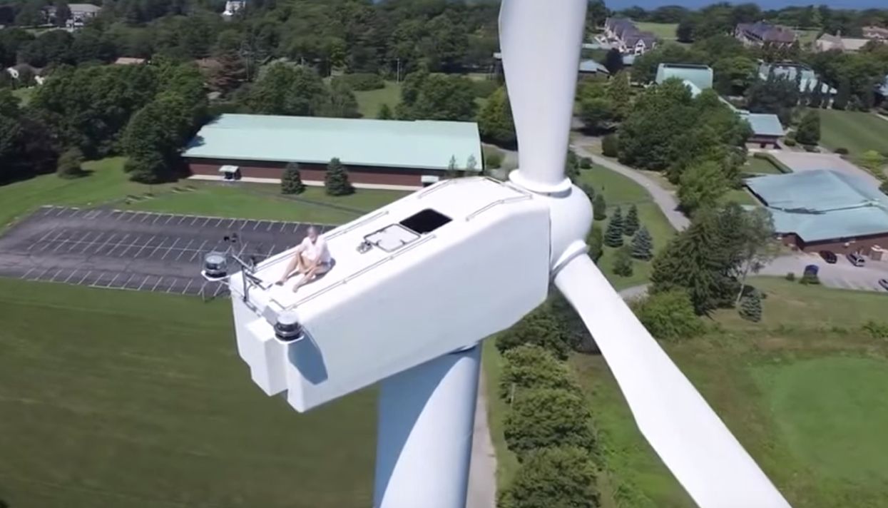 Кевин Миллер из Калифорнии поехал отдыхать в штат Род-Айленд и решил снять там с беспилотника шестидесятиметровый ветрогенератор. Но когда дрон поднялся над установкой, он увидел, что наверху кто-то загорает. Мужчина увидел беспилотник и даже помахал ему.