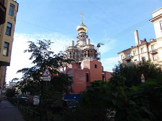 Чтобы сделать несколько снимков и осмотреть место, я отправилась на велосипеде на Петроградку. Свернув на Лахтинскую улицу с Малого проспекта, я сразу поняла, что у цели: из ровной застройки выдаются краснокирпичные стены в лесах и торчит золотая луковка. Подъезжаю ближе, паркуюсь у детской площадки. Жизнь идет своим чередом: дети на качелях, мамы на скамейках, дверь в парадную дома Лишневского распахнута, пахнет стряпней. Судя по линялому фасаду, дом не реставрировали уже лет сто — с момента постройки. И если бы напротив него не стали строить храм, до Мефистофеля не было бы никому дела, кроме местных ценителей макабра. Достаю фотоаппарат, прицеливаюсь. Вдруг слышу голос бабушки: