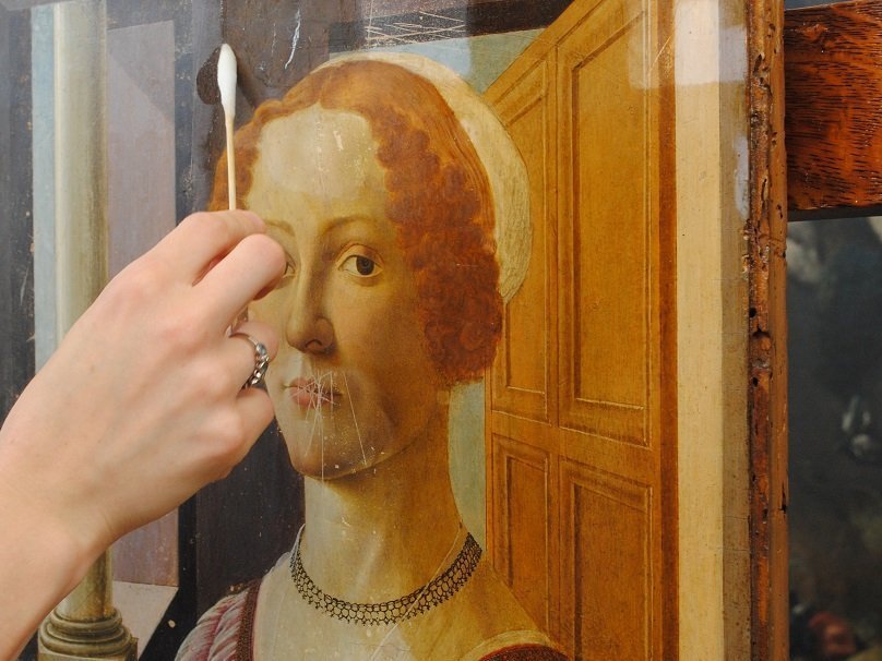 Сейчас сотрудники Музея Виктории и Альберта, готовясь к выставке Botticelli Reimagined, провели реставрацию и тщательное исследование портрета. Одной из их целей было определить степень вмешательства Россетти. Сначала они удалили верхние слои прозрачного лака. Затем изучили красочные слов в инфракрасных лучах. В результате обнаружилось, что слоев краски на волосах женщины, значительно меньше, чем они рассчитывали увидеть. Красный пигмент оказался темперой и был нанесен рукой самого Боттичелли. Россетти же, как выяснилось, лишь очень деликатно подретушировал небольшие поврежденные участки на лице женщины и на головном уборе.