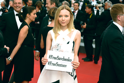 Украинская певица Иванна Сахно в Каннах с плакатом в поддержку Олега Сенцова и Надежды Савченко,