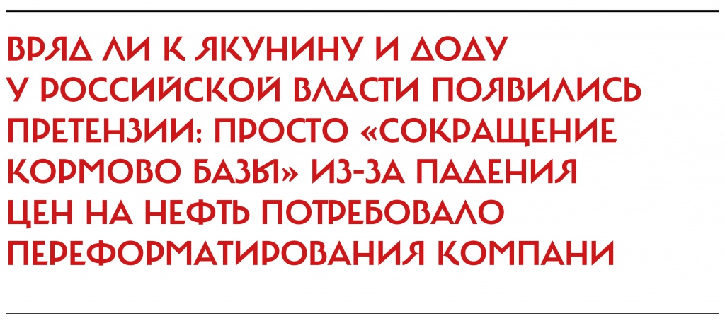 Шумные отставки Отставка главы Российских железных дорог Владимира Якунина породила множество толков о том, что за ней стоит: газетная перепалка источников во властных структурах, то обвиняющих главу РЖД в неэффективности и неспособности приспосабливаться к новым условиям, то опровергающих эту неэффективность, была впечатляющей. Грядущая отставка главы «РусГидро» Евгения Дода породила существенно меньше слухов. Тем не менее обе они были достаточно предсказуемы и связаны, по всей видимости, именно с летним снижением цен на нефть. Мало того, вряд ли к Якунину и Доду у российской власти появились претензии как таковые. Объяснения наших собеседников в правительстве сводятся к тому, что обе компании являются госбизнесом, на котором в 2011–2014 годах зарабатывали сразу несколько групп, приближенных к власти: «сокращение кормовой базы» из-за падения цен на нефть требовало, по этой версии, переформатирования компаний.