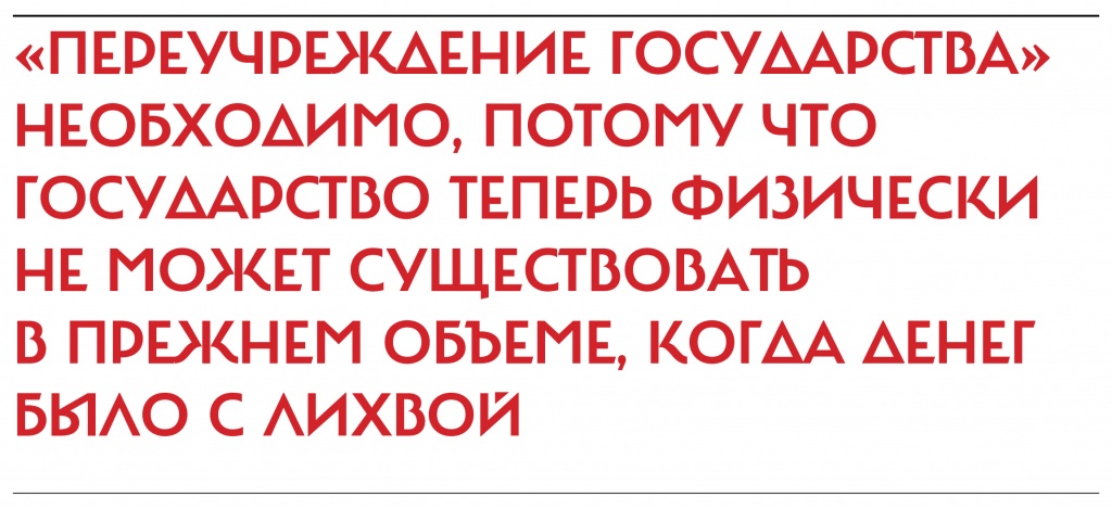 «Переучреждение государства» необходимо, потому что государство теперь физически не может существовать в прежнем объеме, когда денег было с лихвой. Теперь либо сохраняем основные институты социального государства, но тогда отказываемся от госпрограммы вооружений, либо — наоборот.