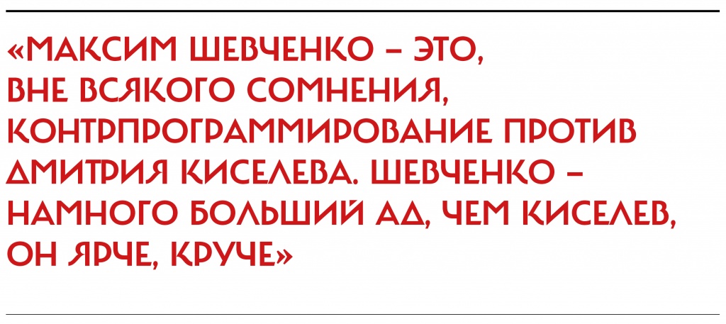 Контрпрограммирование против Киселева Телекритики сходятся в том, что на фоне остальных эфирных рокировок на НТВ самой важной станет приход Максима Шевченко. По мнению Юрия Богомолова, тот «обладает определенной харизмой, жутко болтлив и может заболтать любого человека, щедр на исторические ассоциации и поэтому в силах соревноваться за внимание зрителя». Медиа-аналитик Игорь Яковенко считает новые передачи НТВ и особенно авторское шоу «Точка» классическим случаем контрпрограммирования: «Максим Шевченко — это, вне всякого сомнения, контрпрограммирование против Дмитрия Киселева. Шевченко — намного больший ад, чем Киселев, он ярче, круче. Температура ада будет более высокой. Это, безусловно, попытка захватить вечернюю аудиторию».
