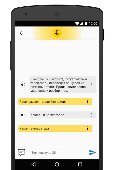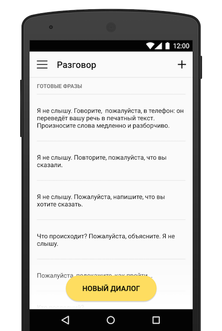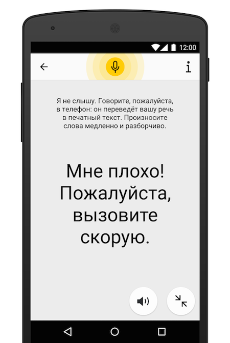 Компания «Яндекс» запустила приложение «Разговор», которое может озвучивать записанные фразы и переводить речь в текст, сообщают в компании. Приложение, по мнению разработчиков, должно помочь людям с нарушениями слуха и тем, кто с ними регулярно общается: родственникам, друзьям и сотрудникам специализированных учреждений. Кроме того, приложение облегчит общение глухих с незнакомыми людьми. Приложение не только распознает речь и озвучивает набранные на смартфоне фразы, но и оснащено базой стандартных формулировок, таких как «Я не слышу. Повторите, пожалуйста, что вы сказали» или «Что происходит? Пожалуйста, объясните. Я не слышу».