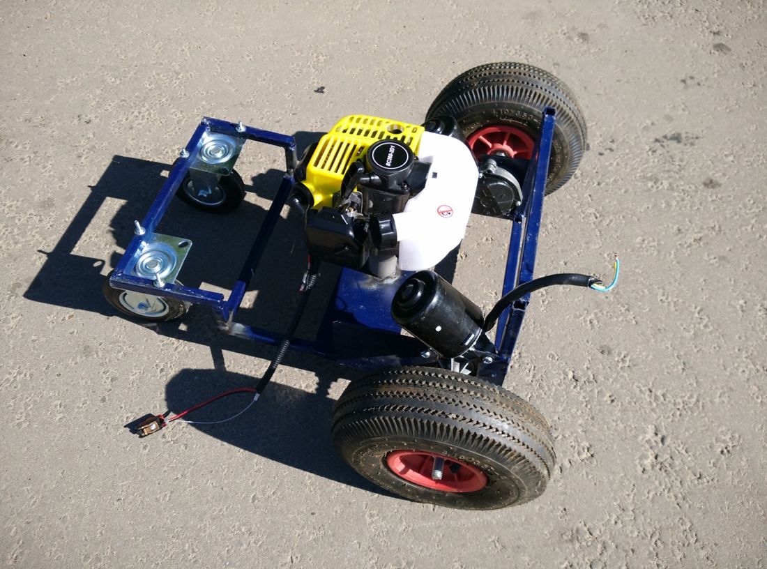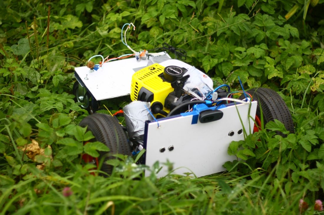Основу для четырехколесного робота изобретатель сварил из чермета, в движение он приводится двумя двигателями с редукторами от стеклоочистителя автомобиля ВАЗ-2108. Непосредственно траву косит двигатель внутреннего сгорания от ручной газонокосилки.